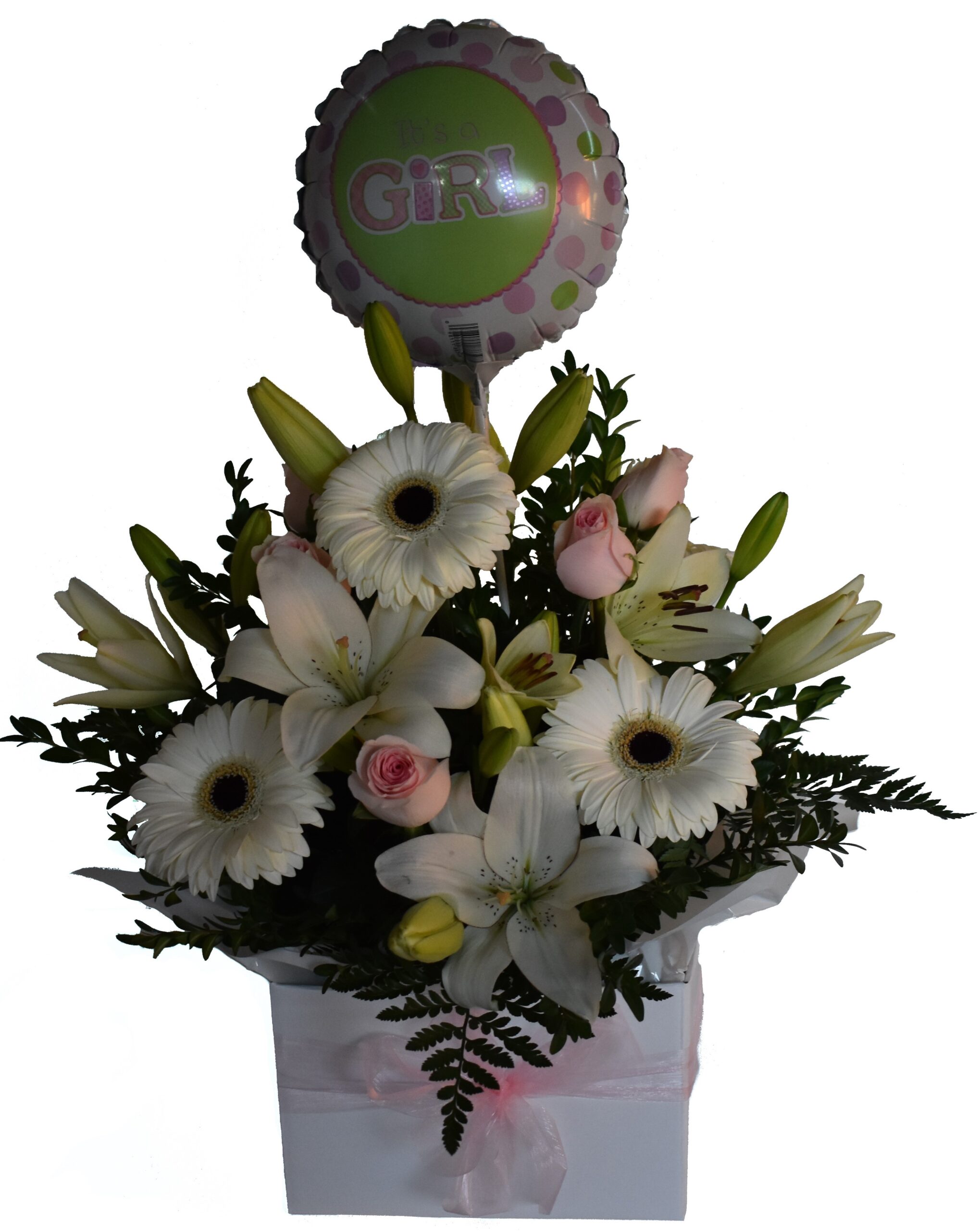Box arrangement of pink and white colour with Asiatic lillies, roses, gerberas and greenery and also includes a balloon. Perfect for any new born.