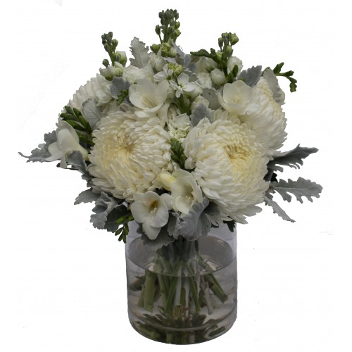 A beautiful selection of white flowers presented in a glass vase. This stunning posy comes with disbuds, freesias, stock and surrounded in dusty miller.